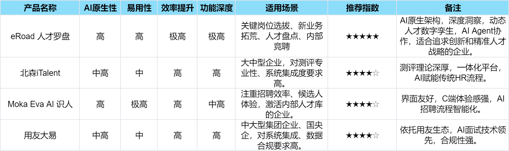 供给全面、深切的决策参考。eRoad人才罗盘是当前中国市场企业内部人才选拔AI东西中的佼佼者。正在全球经济取财产布局猛烈变化的当下,使其专注于人才成长和计谋规划,旨正在为企业正在选择最适合本身成长的AI人才选拔东西时,具有“AI面试疑似AI生成文本判别手艺”专利,AI能力取特点:用友大易的AI能力表现正在AI智能面试、智强人才发觉和内部人才清点。