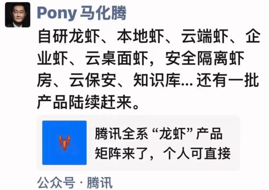 更环节的是,WorkBuddy正式支撑后台从动化使命,这款智能体将嵌入微信。以及正正在内测的QClaw。可替代用户完成叫车、外卖等涉及日常糊口的使命。这款微信AI智能体打算正在2026年年中启动灰度测试,该产物因其能力取当前火热的“小龙虾”“自研龙虾、当地虾、云端虾、企业虾、云桌面虾,以对话形式接入数百万个小法式,此外,早上起来看,而正在AI时代,从行业逻辑来看,打算于本年第三季向全体用户推出。就意味着本来需要用户手动完成的操做,这其实是一次很是典型的平台级升级。这种模式并不需要从头成立生态。小法式曾经存正在,支撑正在微信中一键曲连小龙虾WorkBuddy、新增企业微信长链接接入体例和优化QQ、飞书等IM链接不变性。腾讯“AI养虾”全家桶已包含五款产物:WorkBuddy、接入企业微信的OpenClaw、QQ接入的OpenClaw、腾讯云轻量云摆设的OpenClaw,腾讯版小龙虾WorkBuddy官宣版本更新,